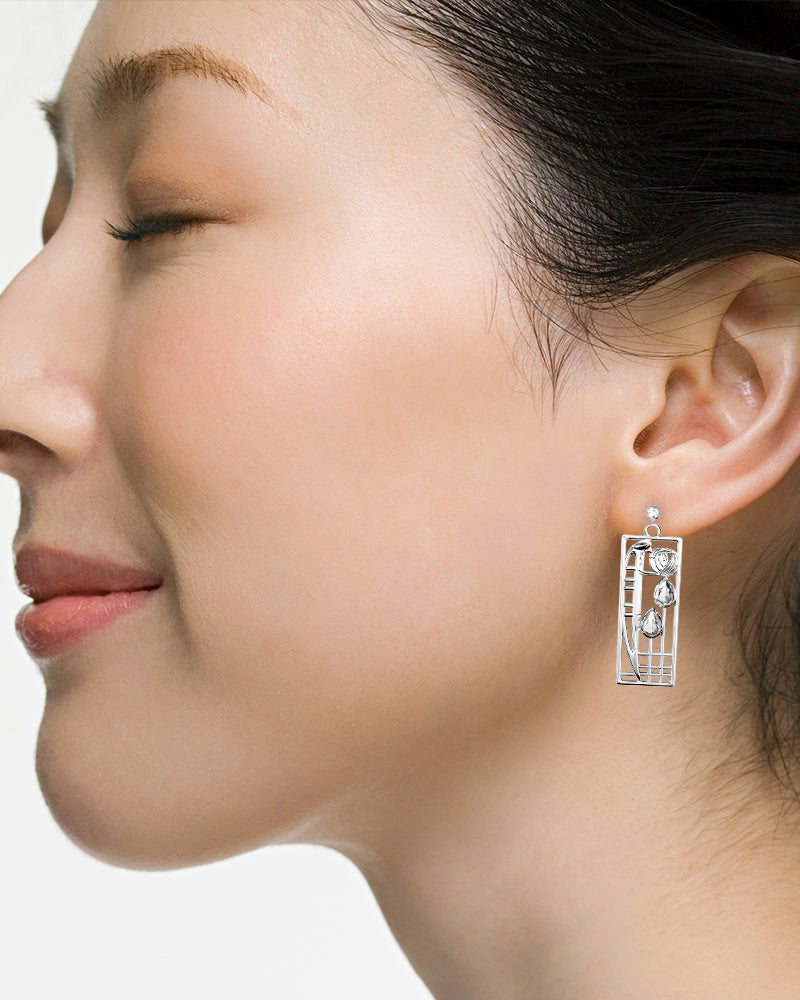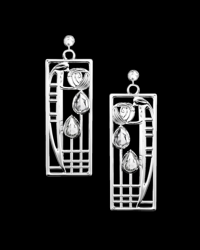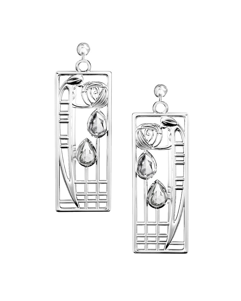 These striking Charles Rennie Mackintosh Lover earrings are crafted in sterling silver and Cubic Zirconia. The design is inspired by a motif from the famous Scottish architect and designer Charles Rennie Mackintosh (1868-1928). Earring Height: 1.02" (26mm). Coordinating Pendant Necklace is also available. Gift boxed.