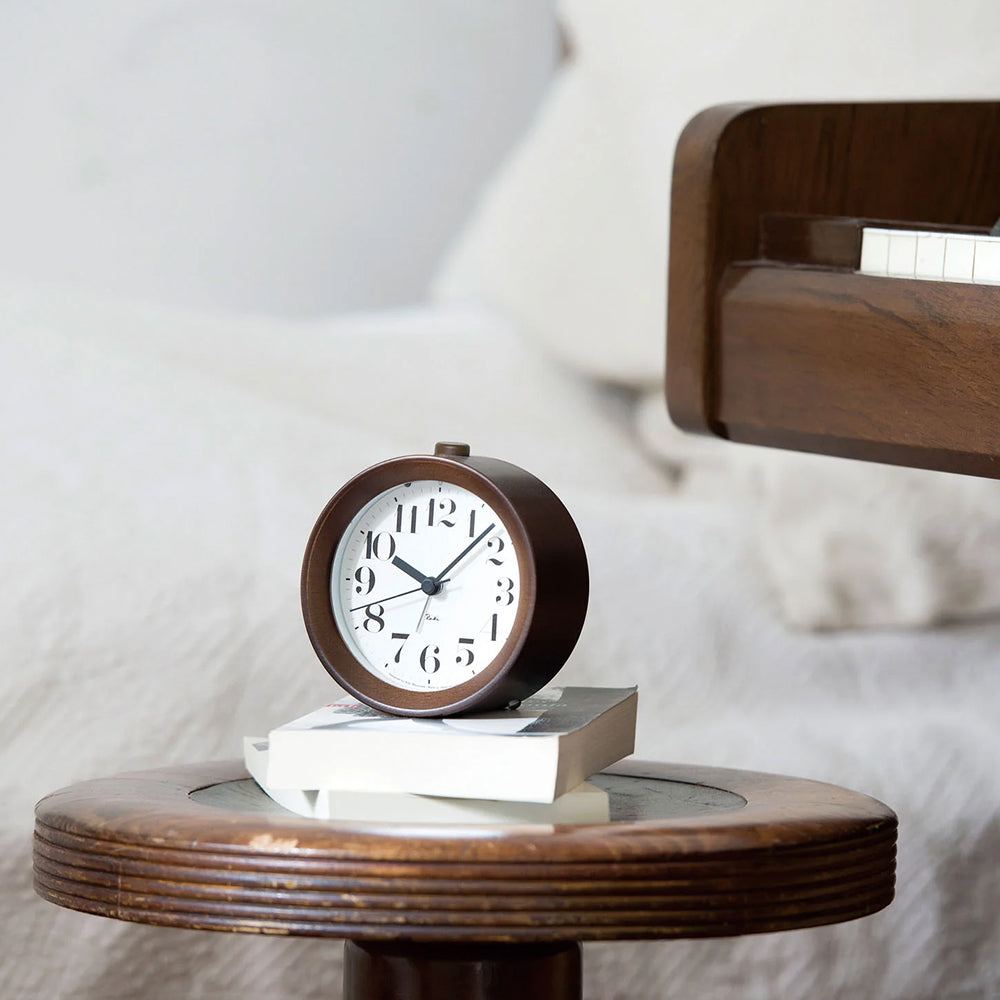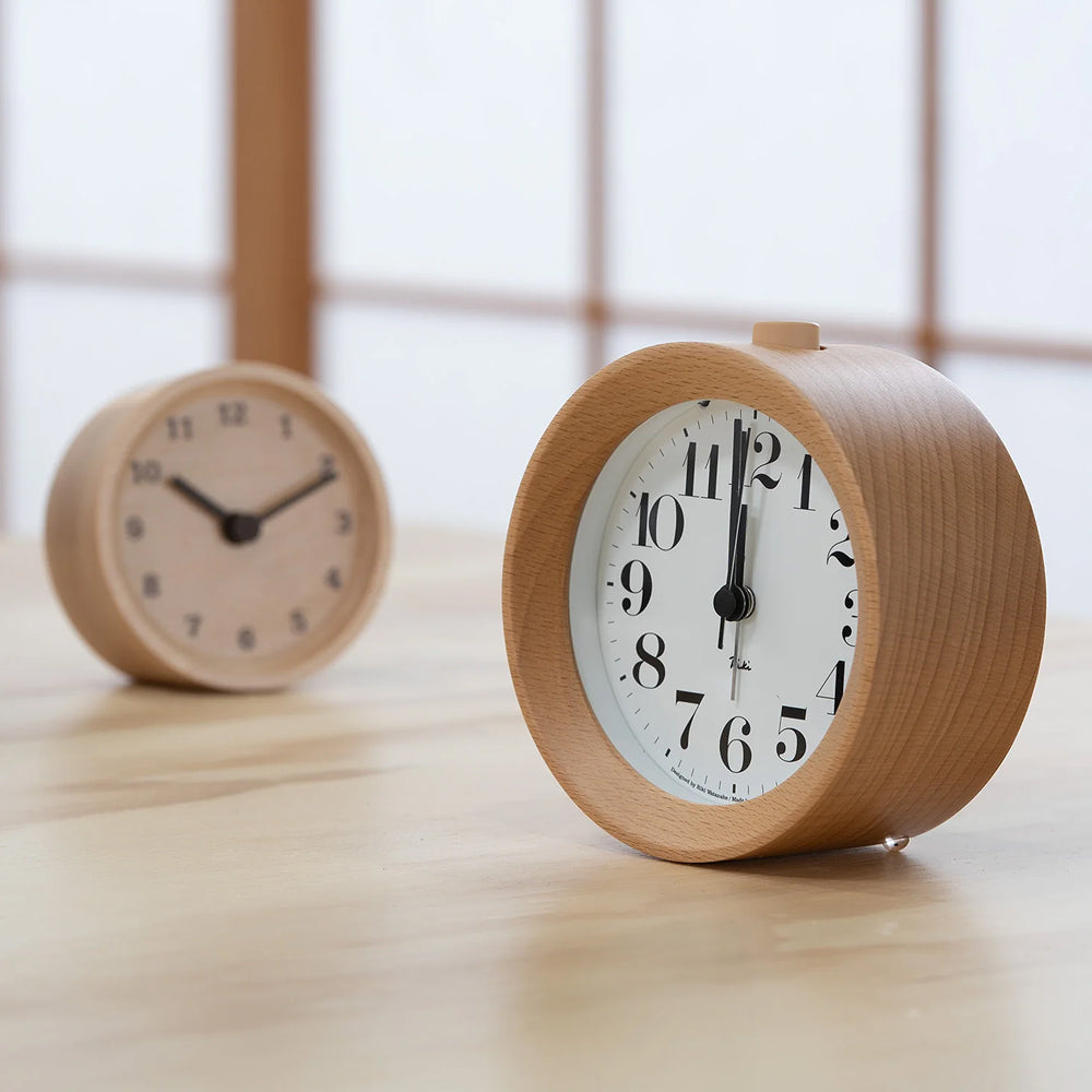 The Lemnos Riki Alarm Clock is a quality and convenient companion for the bedside with a traditional built-in light bulb night light. The alarm sound begins with a gentle continuous beep, slowly ascending in volume. Handmade in Japan with a solid beech wood case and glass face, it has a silent clock hand sweeping movement. It has been selected by The New York Times Wirecutter since 2020 as one of the best alarm clocks on the market. Riki Watanabe (1911 - 2013) was a pioneer of modern Japanese design, receiving many awards including the Milan Triennale Exhibition Gold Award, the Mainichi Design Award, and the Japanese Medal of Honor with purple ribbon awarded by the Government of Japan. Available in Natural, Brown, White, and Gray. Dimensions: 4.3" x 4.5". Runs on AA Batteries (included).