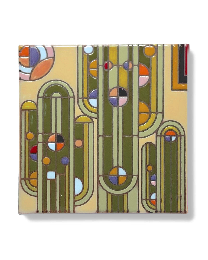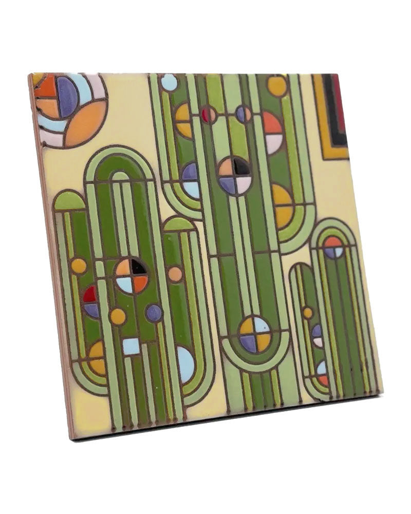 The hand glazed Frank Lloyd Wright Saguaro Forms Ceramic Tile by Carly Quinn is great for use as a coaster, trivet, decorative art piece, or wall art. Each tile is a unique work of art, and glaze variations add to the inherent beauty of each piece. All tiles come cork backed to protect surfaces and have a hole at the top of the backing for easy hanging. Due to the hand glazed nature of these tiles, no two are exactly alike and variations are expected. Dimensions: 6" x 6". Optional black metal display stand available for purchase here.