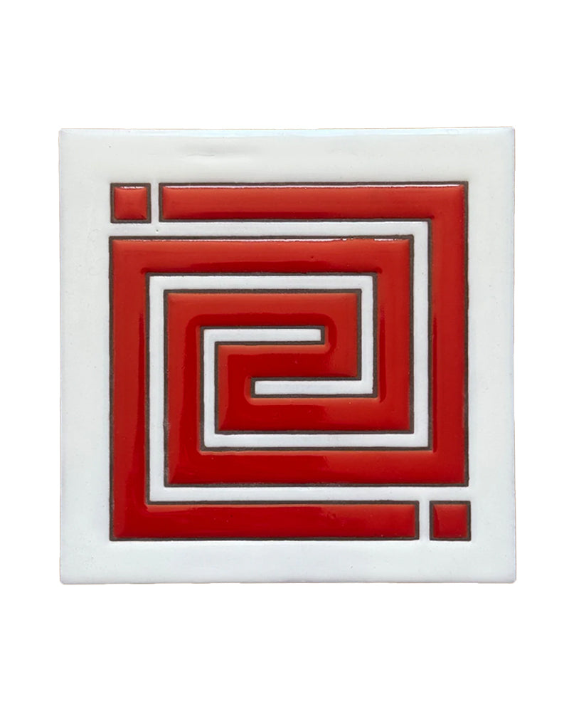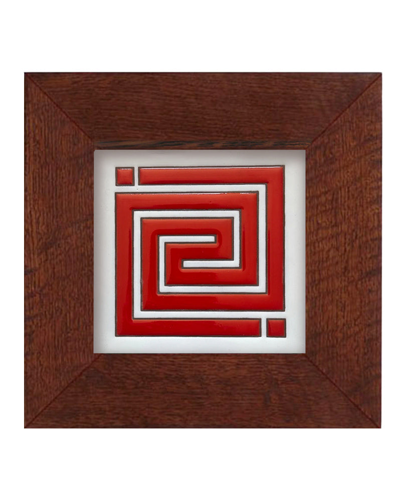 The hand glazed Frank Lloyd Wright Whirling Arrow Ceramic Tile by Carly Quinn is a unique work of art, with glaze variations that add to the distinctive beauty of each piece. Each tile is framed in a hand made quarter-sawn Oak Park frame with signature stain. Please note each frame will have a distinctive wood grain. The frame comes ready to hang with a keyhole notch. Due to the hand painted nature of these tiles, no two are exactly alike and variations are expected. Tile dimensions: 6" x 6". Framed dimensions: 9.5” x 9.5”.