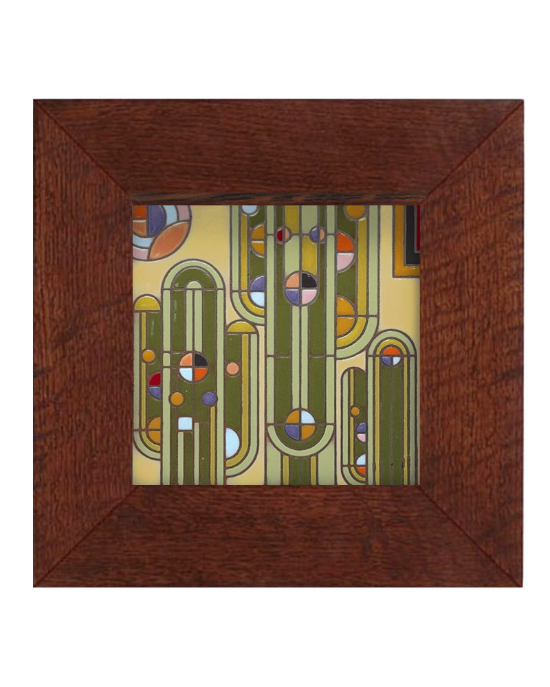 The hand glazed Frank Lloyd Wright Saguaro Ceramic Tile by Carly Quinn is a unique work of art, with glaze variations that add to the distinctive beauty of each piece. Each tile is framed in a hand made quarter-sawn Oak Park frame with signature stain. Please note each frame will have a distinctive wood grain. The frame comes ready to hang with a keyhole notch. Due to the hand painted nature of these tiles, no two are exactly alike and variations are expected. Tile dimensions: 6" x 6". Framed dimensions: 9.5” x 9.5”.