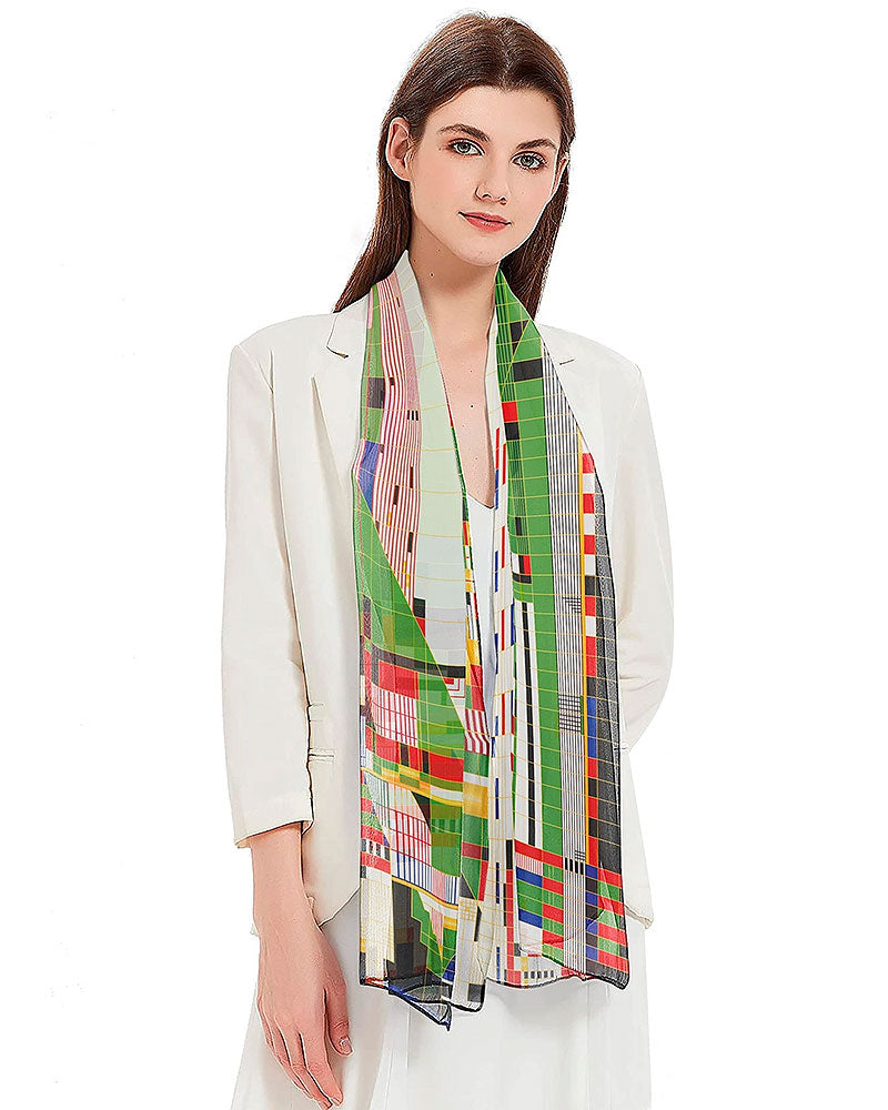 The Frank Lloyd Hillside Curtain Sheer Scarf is a rendering of the pattern found on the Hillside Theatre Curtain, which is still in use today. Hand Wash: Warm or cold water, no bleach. Hang to dry. 100% polyester. 72"L x 18"W (183cm x 46cm).