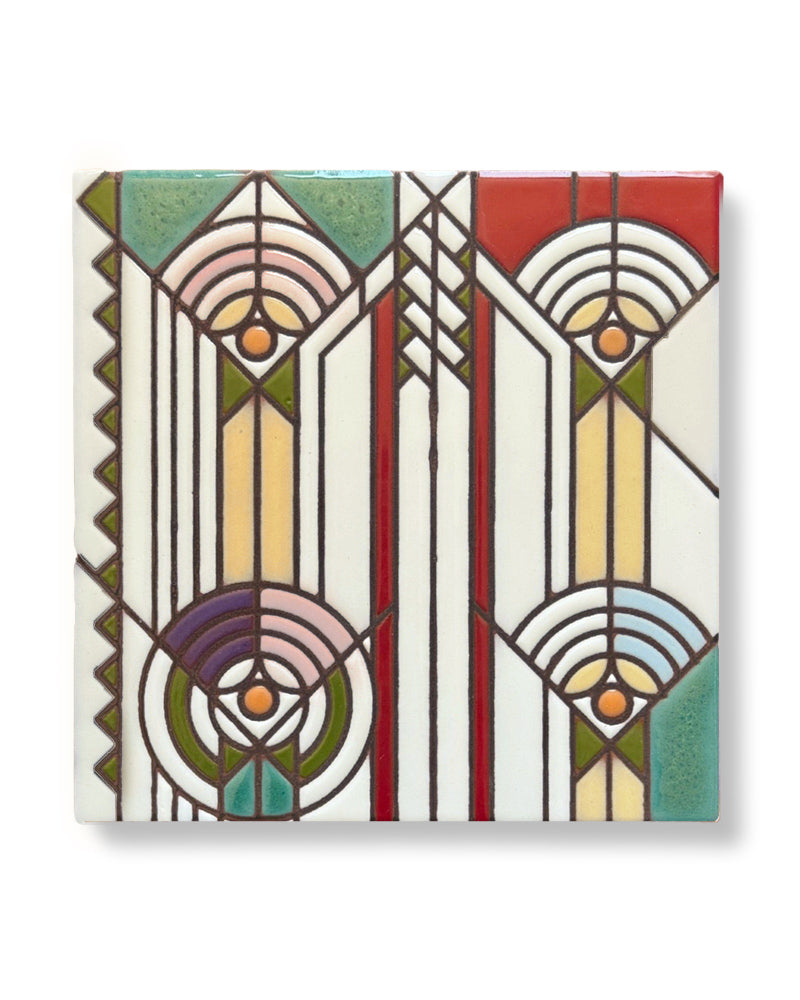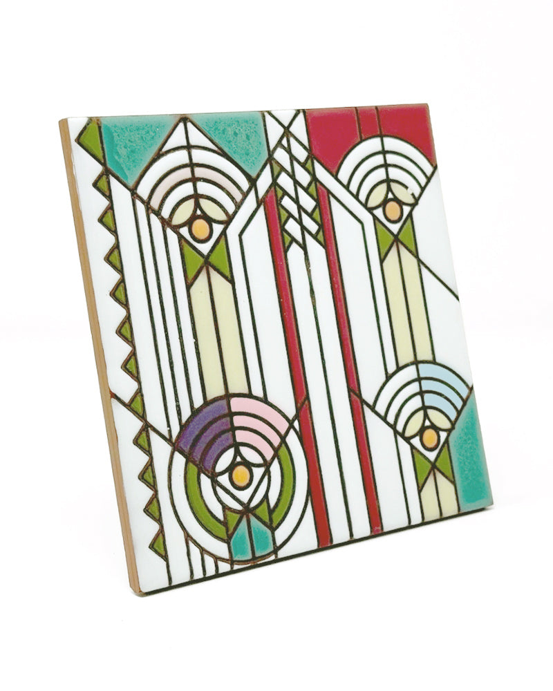 The hand glazed Frank Lloyd Wright April Showers Ceramic Tile by Carly Quinn is great for use as a coaster, trivet, decorative art piece, or wall art. Each tile is a unique work of art, and glaze variations add to the inherent beauty of each piece. All tiles come cork backed to protect surfaces and have a hole at the top of the backing for easy hanging. Due to the hand glazed nature of these tiles, no two are exactly alike and variations are expected. Dimensions: 6" x 6". Optional black metal display stand available for purchase here.