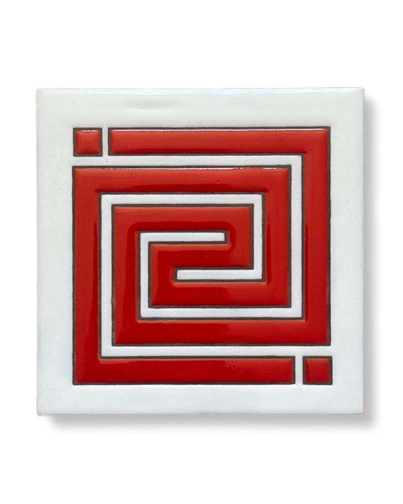 The hand glazed Frank Lloyd Wright Whirling Arrow Ceramic Tile by Carly Quinn is great for use as a coaster, trivet, decorative art piece, or wall art. Each tile is a unique work of art, and glaze variations add to the inherent beauty of each piece. All tiles come cork backed to protect surfaces and have a hole at the top of the backing for easy hanging. Due to the hand glazed nature of these tiles, no two are exactly alike and variations are expected. Dimensions: 6" x 6". Optional black metal display stand available for purchase here.