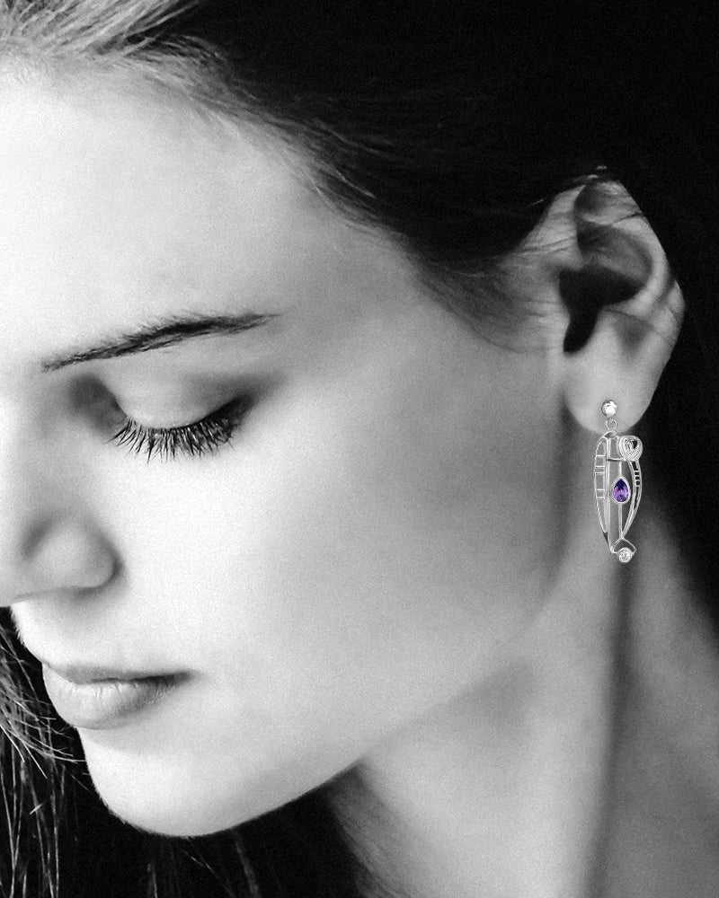 These striking Charles Rennie Mackintosh Catherine Earrings are crafted in sterling silver and feature a stunning amethyst and cubic zirconia combination. The design is inspired by a motif from the famous Scottish architect and designer Charles Rennie Mackintosh (1868-1928). Earring Height: 1.3" (33mm). Coordinating Pendant Necklace is also available. Gift boxed.
