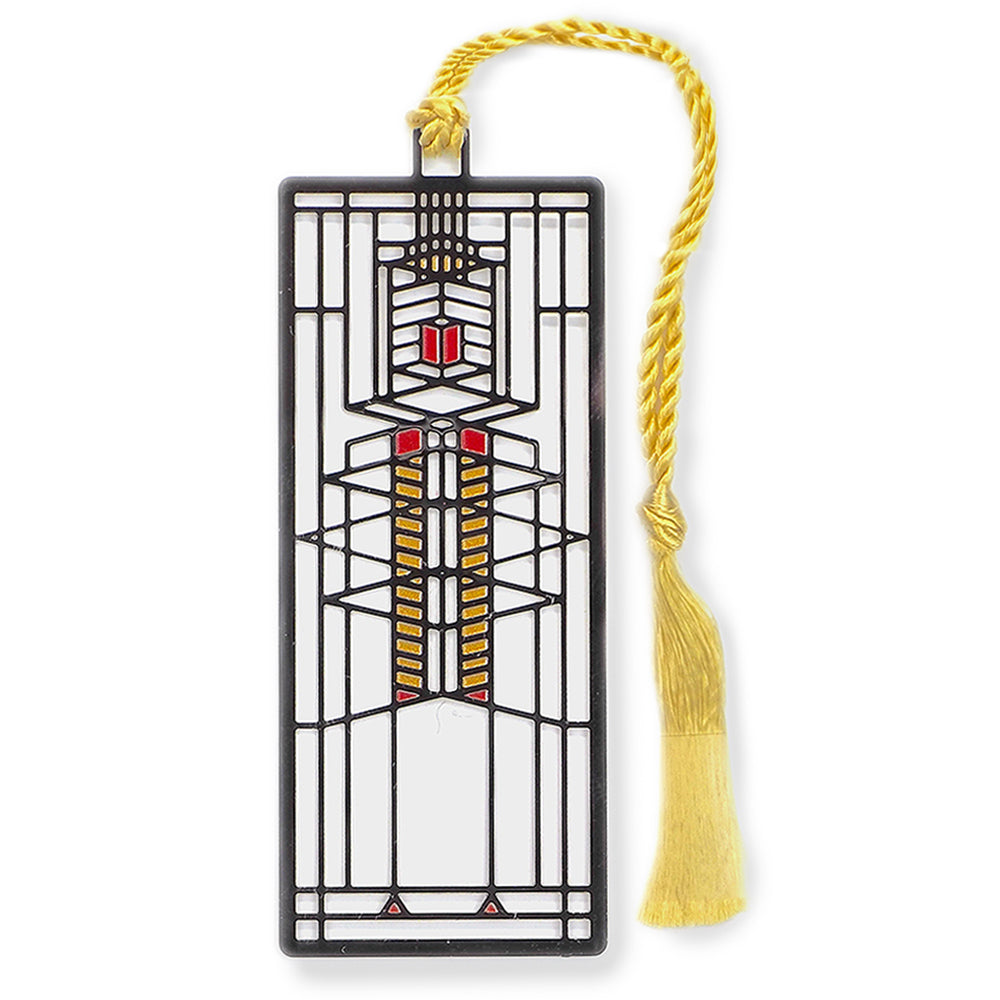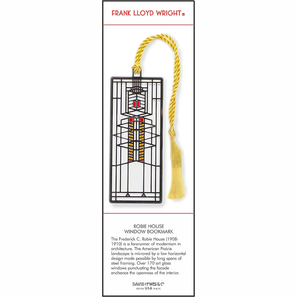 The Frank Lloyd Wright Robie House Window Bookmark is adapted from an art glass window in the Robie House. Tarnish resistant electro-plated silver finish on brass. Made in the USA. Packaged in a sleeve with descriptive insert. Dimensions: 3.3" x 1.3".