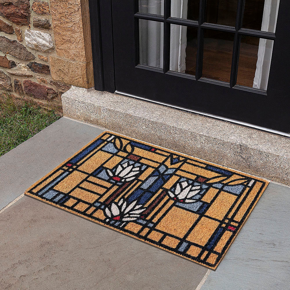 The Frank Lloyd Wright Waterlilies doormat, depicting flowers and lily pads floating in a tranquil pool, has a design adapted from an unrealized leaded stained glass window designed by Wright circa 1893-95. In this early design, the organic forms and repeating motifs display Wright’s commitment to the integration of nature translated into geometric form manifested in his architectural work. Constructed in 100% natural coir with PVC backing, the doormat is recommended for use in a sheltered area not exposed to direct sunlight or moisture to preserve longevity. Shake or vacuum clean. The proportions of this mat are 30 inches by 18 inches. The Frank Lloyd Wright Waterlilies Doormat is officially licensed by the Frank Lloyd Wright Foundation.