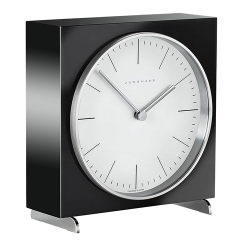 The Max Bill Tischuhr (Table Clock) was created my Max Bill in 1958, and revised by Klein & More in 2012 for the Max Bill Series by Junghans. The clock has a J738 Quartz movement. Size: 6.46" (164mm) height, 6.85" (174mm) width, depth 2.17 (55mm) [2.95" (75mm) with feet]. Face: matte white dial. Glass: mineral crystal. Case: wood, polished piano black lacquer finish. Polished hands. Runs on single AA battery (not included).