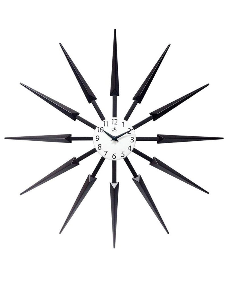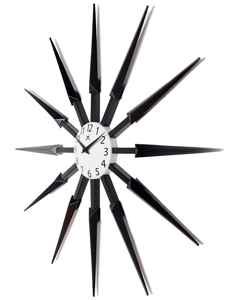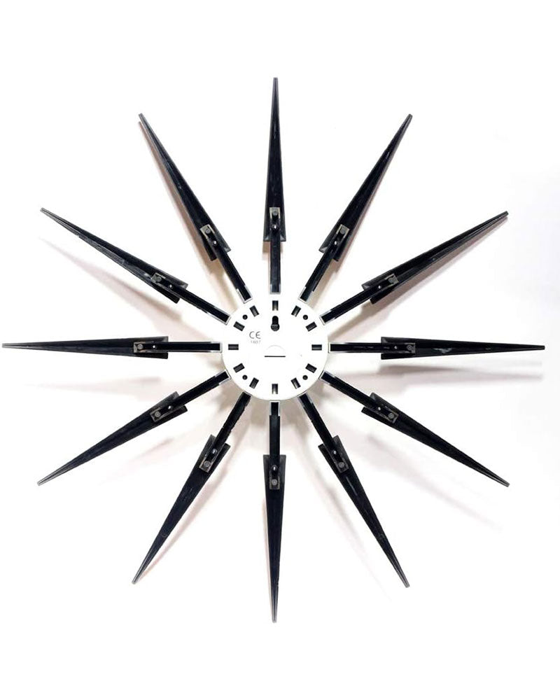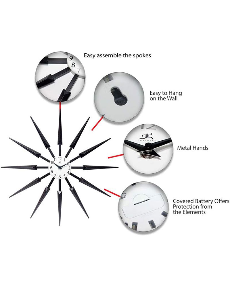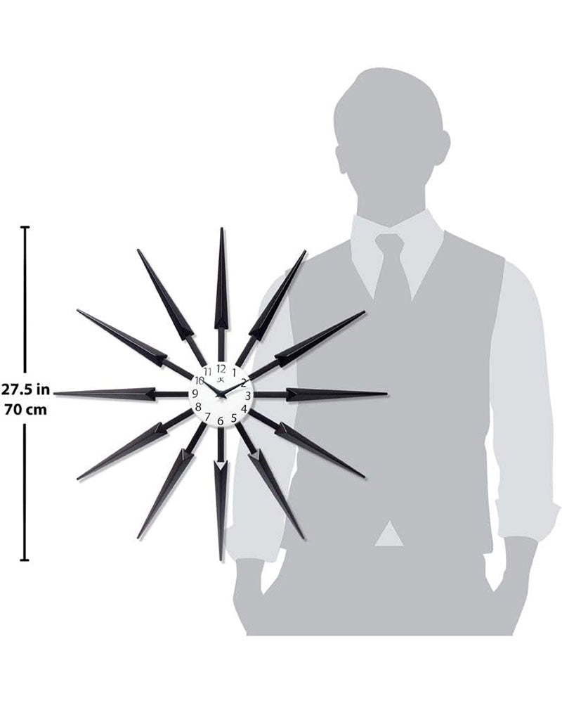 The Sunburst Mid-Century Modern Wall Clock - Dark directly references clocks from the mid-century modern design period (approx. 1940s-1960s). The "spoke" element of the clock with radiating lines is a common motif of the period, and is often referred to as a starburst pattern. This clock features a striking open face with metal spokes radiating from its center, and bold hands further enhancing its geometric design. The Sunburst Clock is a nostalgic, quirky and fun addition to any room, and designed to be both a functional timepiece and a decorative design element. This modern interpretation of a classic design incorporates the elements like the starburst shape details that were popular in the original mid-century clocks such as the famous George Nelson Sunburst Clock. Minor assembly required. Dimensions: Total diameter: 24.5”. Dial diameter: 5”. Silent Quartz movement, powered by one “AA” battery (not included).